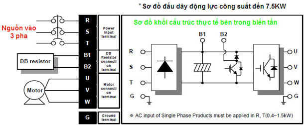 Nguồn vào 3 pha r, s, t. nếu là 1 pha thường vào r, t. động cơ đấu vào u, v, w. b1, b2 dùng để gắn điện trở hãm động năng.