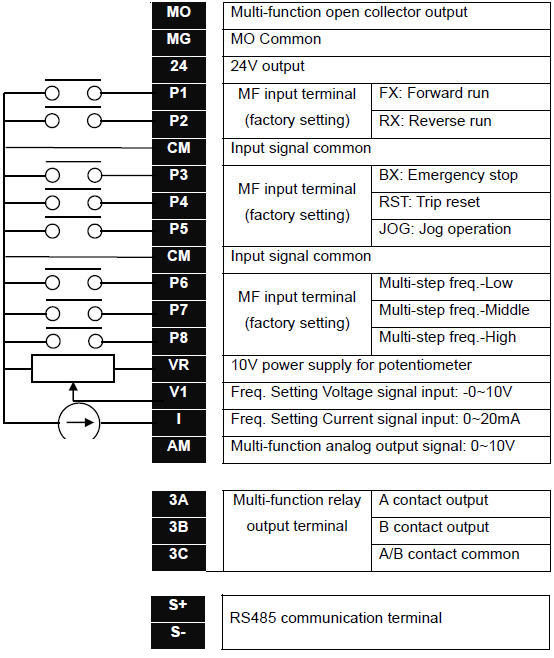 Nếu điều khiển động cơ trực trên bàn phím của biến tần ta dùng sơ đồ cơ bản như sau :