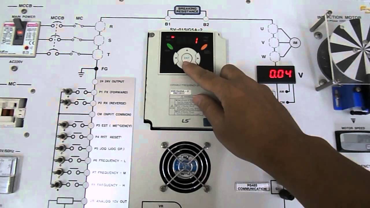 lệnh chạy : ở màn hình hiện tần số, nhấn mũi tên lên / xuống => đến hiện drv => nhấn enter (nút tròn ở giữa) => chỉnhlên / xuống thay đổi giá trị = 1 => nhấn enter => số chớp nháy =>nhấn enter lần nữa xác nhận.